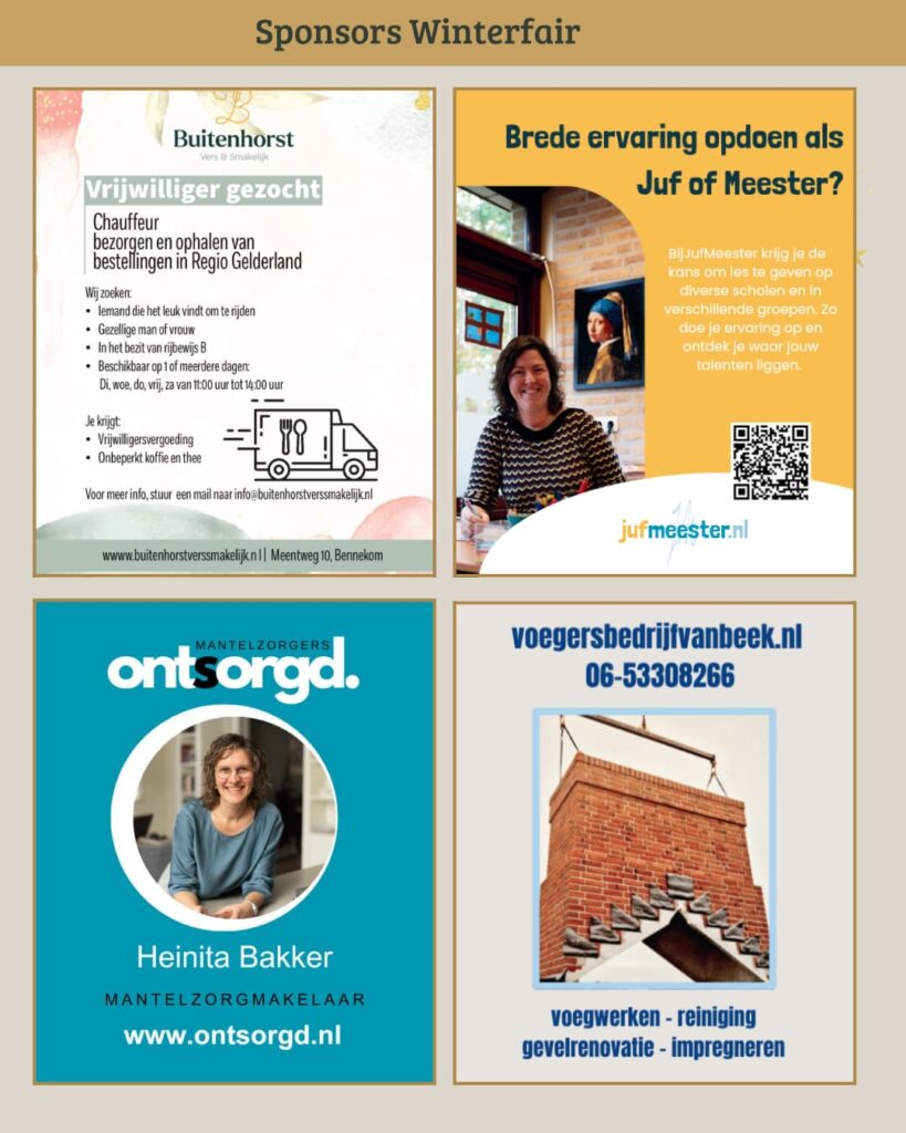 Op zaterdag 13 december houden we weer een gezellige winterfair! Kom lekker struinen langs alle kraampjes! Er wordt onder meer advocaat, erwtensoep, koek en groendecoraties verkocht.
